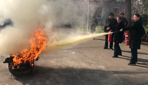 圖為滅火器使用模擬演練現(xiàn)場 “保險栓要先打開。” “用前記得搖一搖。” “不要怕,對準(zhǔn)火源再噴,別急?!?/span> 隨后,該所開展滅火器使用模擬演練。在演練中,大家利用平時更換下來的舊滅火器,依次輪流進(jìn)行操作,更有一些老員工主動熱心幫助新員工講解如何正確使用滅火器,以身示范正確操作方式及每一個分解動作要領(lǐng)。