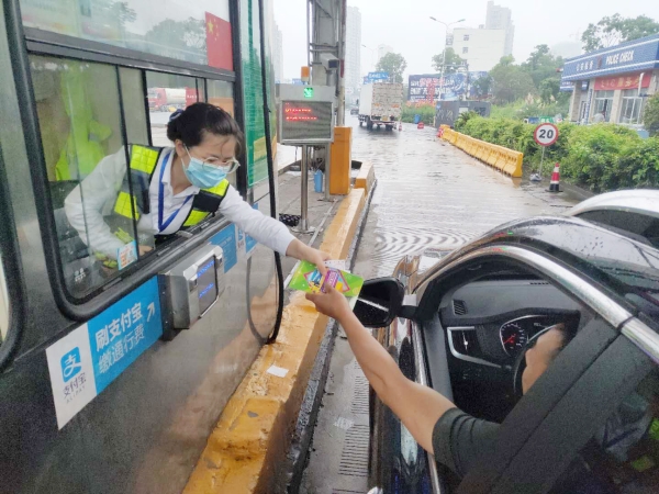 圖為收費(fèi)員向過(guò)往司乘發(fā)放宣傳單